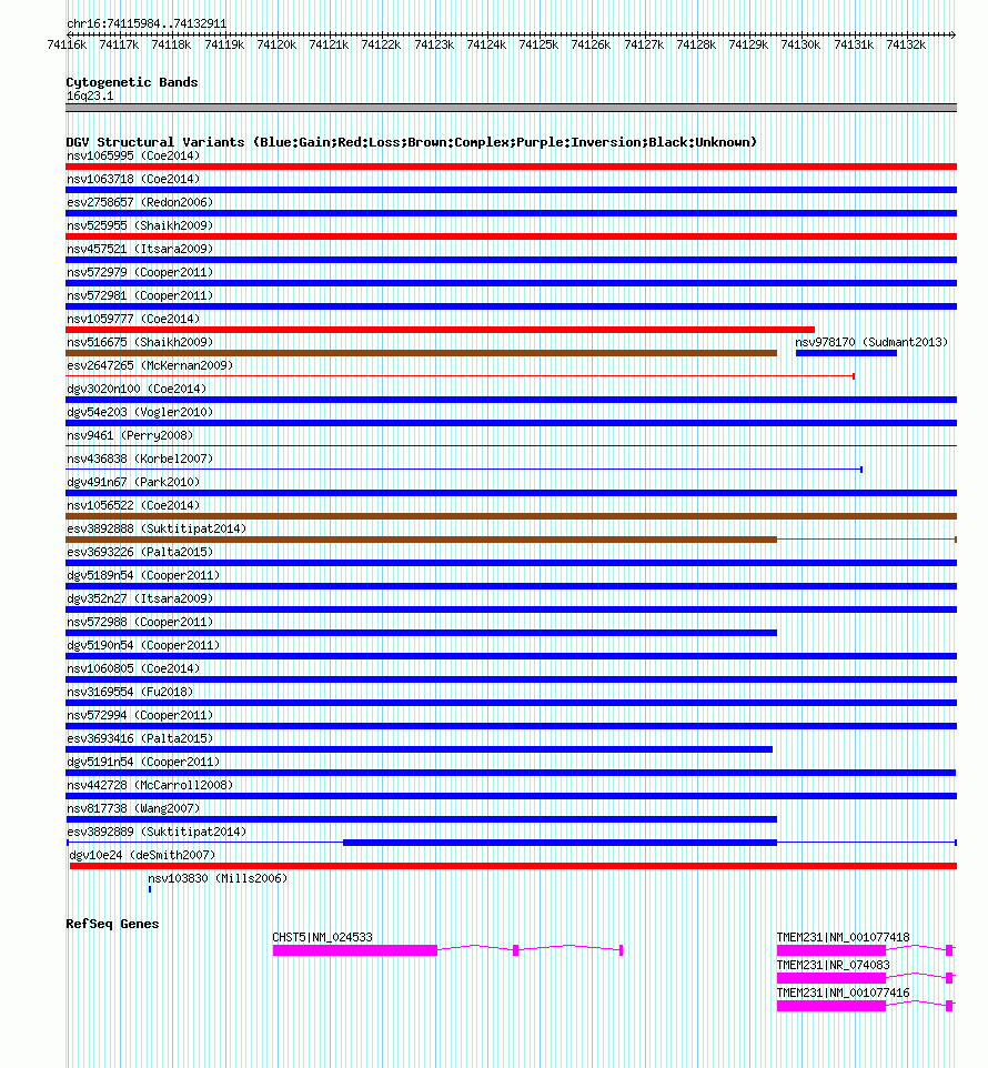 Variant DetailsVariant: esv3892889| Internal ID | 19183709 | | Landmark | | | Location Information | | | Cytoband | 16q23.1 | | Allele length | | Assembly | Allele length | | hg38 | 16928 | | hg19 | 16928 | | hg18 | 16928 |