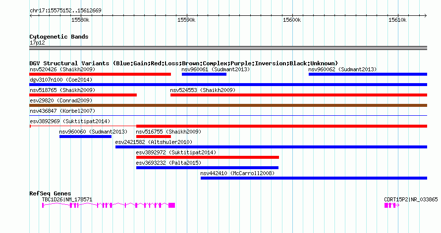 Variant DetailsVariant: esv3892969| Internal ID | 19183789 | | Landmark | | | Location Information | | | Cytoband | 17p12 | | Allele length | | Assembly | Allele length | | hg38 | 37518 | | hg19 | 37518 | | hg18 | 37518 |