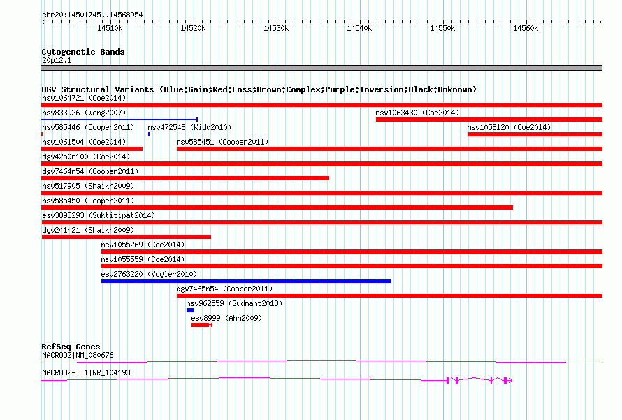 | Variant Type | CNV loss | Copy Number | | Allele State | | Allele Origin | | Probe Count | | Validation Flag | | Merged Status | M | Merged Variants | | Supporting Variants | essv25799031 | Samples | | Known Genes | MACROD2, MACROD2-IT1 | Method | SNP array | Analysis | | Platform | Illumina HumanHap 610 | Comments | | Reference | Suktitipat_et_al_2014 | Pubmed ID | 25118596 | Accession Number(s) | esv3893293
