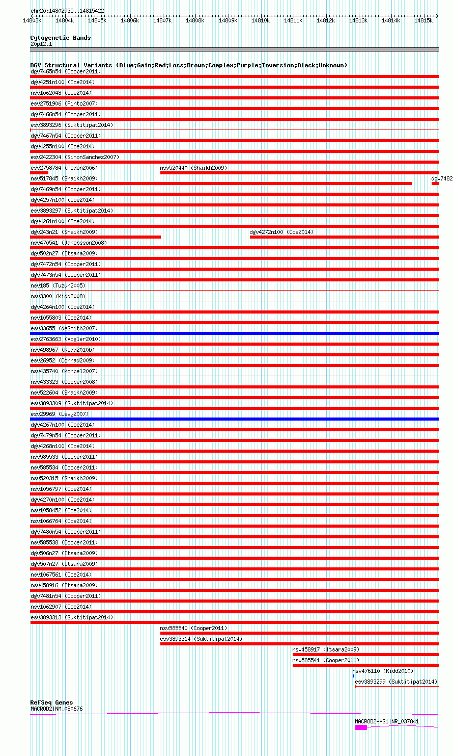 Variant DetailsVariant: esv3893313| Internal ID | 19184133 | | Landmark | | | Location Information | | | Cytoband | 20p12.1 | | Allele length | | Assembly | Allele length | | hg38 | 12488 | | hg19 | 12488 | | hg18 | 12488 |