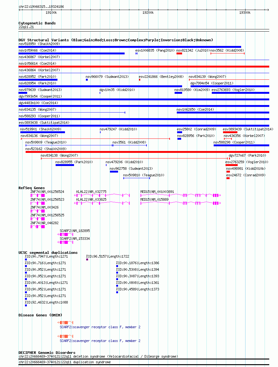 Variant DetailsVariant: esv3893438| Internal ID | 18837572 | | Landmark | | | Location Information | | | Cytoband | 22q11.21 | | Allele length | | Assembly | Allele length | | hg38 | 257875 | | hg19 | 257872 | | hg18 | 257872 |