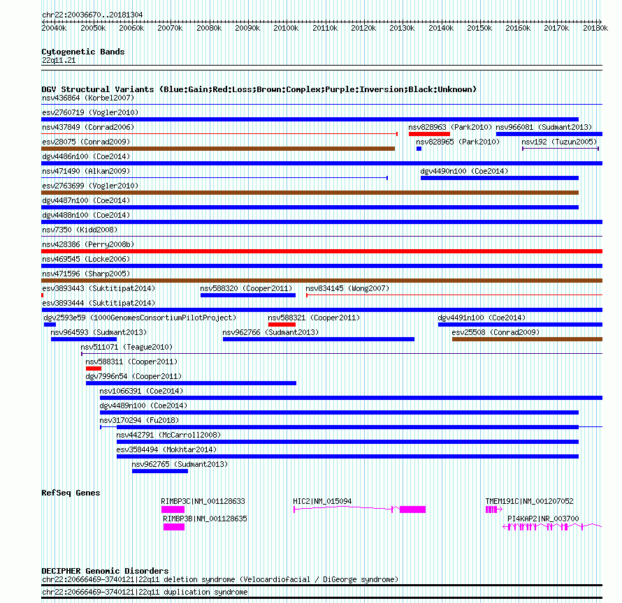 Variant DetailsVariant: esv3893444| Internal ID | 19184264 | | Landmark | | | Location Information | | | Cytoband | 22q11.21 | | Allele length | | Assembly | Allele length | | hg38 | 144635 | | hg19 | 144635 | | hg18 | 144635 |