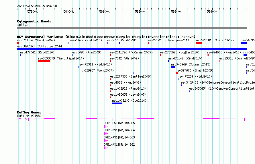 | | Variant Type | CNV gain | | Copy Number | | | Allele State | | | Allele Origin | | | Probe Count | | | Validation Flag | | | Merged Status | M | | Merged Variants | | | Supporting Variants | essv25789659 | | Samples | | | Known Genes | DAB1, DAB1-AS1 | | Method | SNP array | | Analysis | | | Platform | Illumina HumanHap 610 | | Comments | | | Reference | Suktitipat_et_al_2014 | | Pubmed ID | 25118596 | | Accession Number(s) | esv3893568