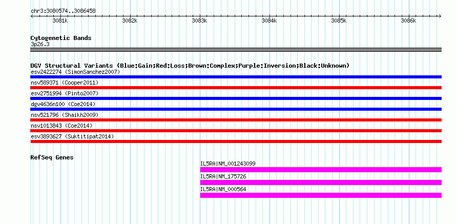 | Variant Type | CNV loss | Copy Number | | Allele State | | Allele Origin | | Probe Count | | Validation Flag | | Merged Status | M | Merged Variants | | Supporting Variants | essv25799799 | Samples | | Known Genes | IL5RA | Method | SNP array | Analysis | | Platform | Illumina HumanHap 610 | Comments | | Reference | Suktitipat_et_al_2014 | Pubmed ID | 25118596 | Accession Number(s) | esv3893627