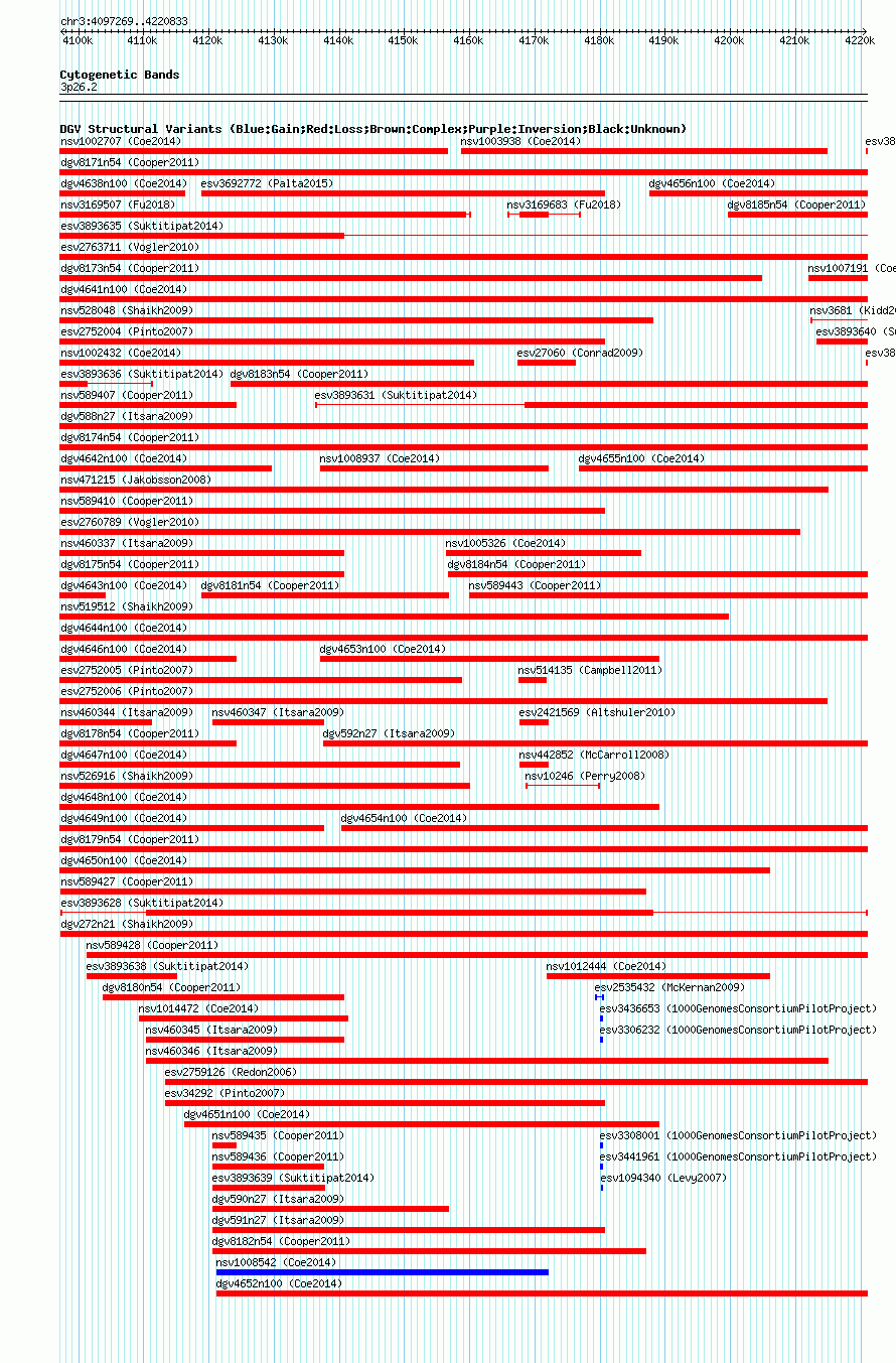 Variant DetailsVariant: esv3893628| Internal ID | 19184448 | | Landmark | | | Location Information | | | Cytoband | 3p26.1 | | Allele length | | Assembly | Allele length | | hg38 | 123565 | | hg19 | 123565 | | hg18 | 123565 |