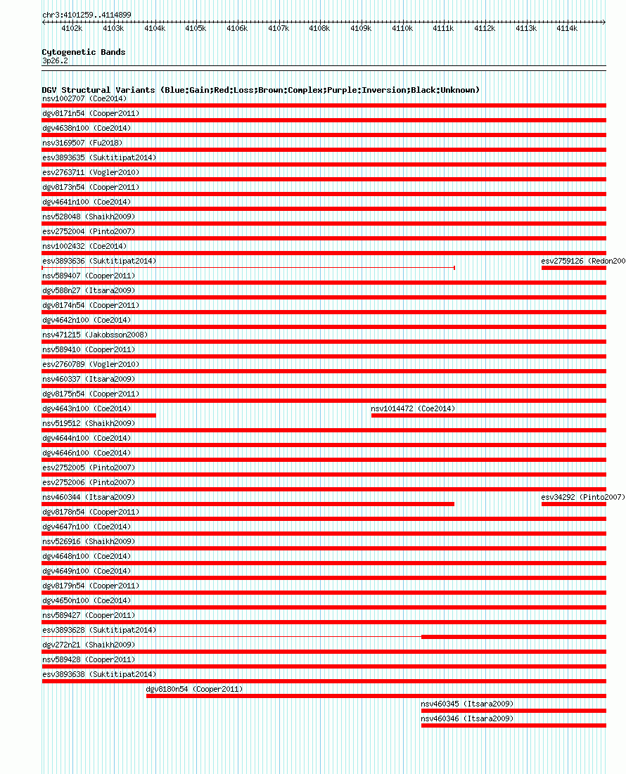Variant DetailsVariant: esv3893638| Internal ID | 19184458 | | Landmark | | | Location Information | | | Cytoband | 3p26.1 | | Allele length | | Assembly | Allele length | | hg38 | 13641 | | hg19 | 13641 | | hg18 | 13641 |