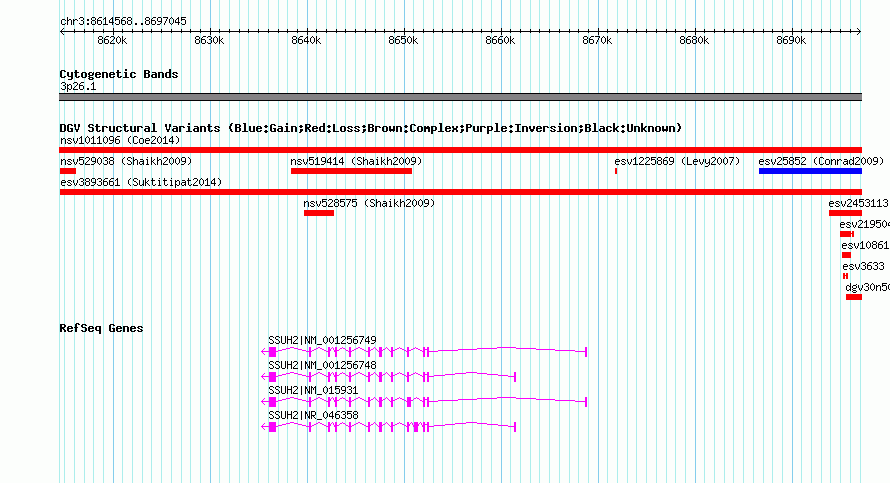| | Variant Type | CNV loss | | Copy Number | | | Allele State | | | Allele Origin | | | Probe Count | | | Validation Flag | | | Merged Status | M | | Merged Variants | | | Supporting Variants | essv25799806 | | Samples | | | Known Genes | SSUH2 | | Method | SNP array | | Analysis | | | Platform | Illumina HumanHap 610 | | Comments | | | Reference | Suktitipat_et_al_2014 | | Pubmed ID | 25118596 | | Accession Number(s) | esv3893661