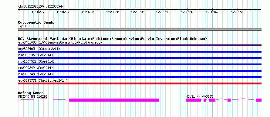 | | Variant Type | CNV loss | | Copy Number | | | Allele State | | | Allele Origin | | | Probe Count | | | Validation Flag | | | Merged Status | M | | Merged Variants | | | Supporting Variants | essv25782737 | | Samples | | | Known Genes | FBXO40, HCLS1 | | Method | SNP array | | Analysis | | | Platform | Illumina HumanHap 610 | | Comments | | | Reference | Suktitipat_et_al_2014 | | Pubmed ID | 25118596 | | Accession Number(s) | esv3893771