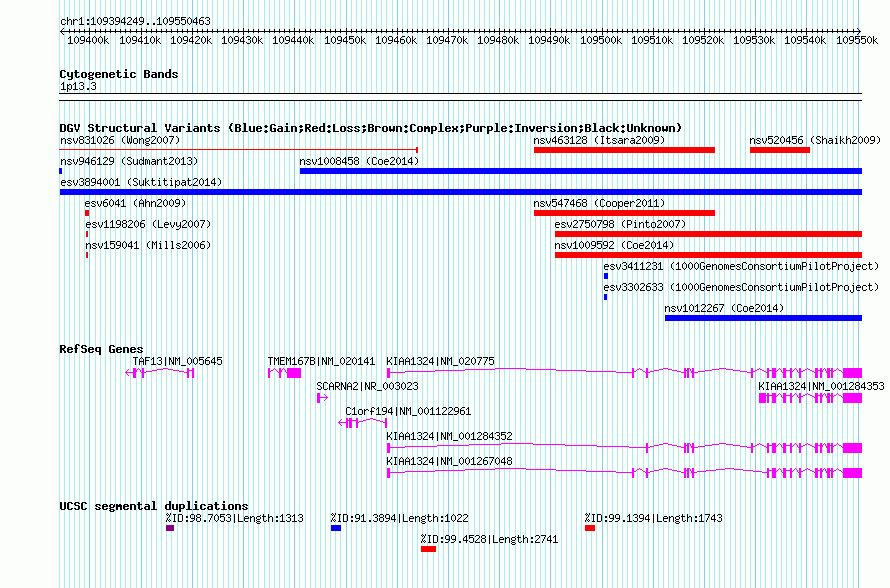 | Variant Type | CNV gain | Copy Number | | Allele State | | Allele Origin | | Probe Count | | Validation Flag | | Merged Status | M | Merged Variants | | Supporting Variants | essv25789557 | Samples | | Known Genes | C1orf194, KIAA1324, SCARNA2, TAF13, TMEM167B | Method | SNP array | Analysis | | Platform | Illumina HumanHap 610 | Comments | | Reference | Suktitipat_et_al_2014 | Pubmed ID | 25118596 | Accession Number(s) | esv3894001