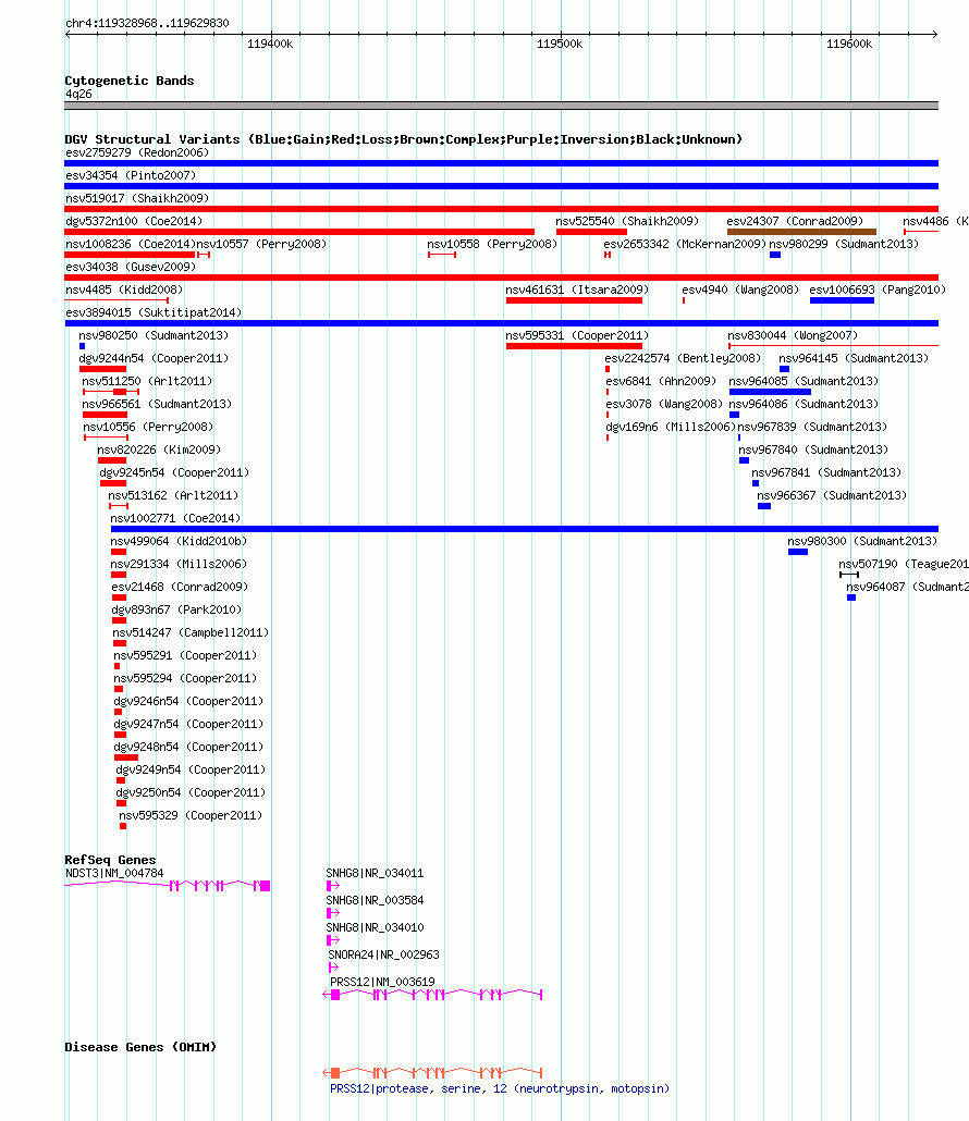 | | Variant Type | CNV gain | | Copy Number | | | Allele State | | | Allele Origin | | | Probe Count | | | Validation Flag | | | Merged Status | M | | Merged Variants | | | Supporting Variants | essv25789075 | | Samples | | | Known Genes | NDST3, PRSS12, SNHG8, SNORA24 | | Method | SNP array | | Analysis | | | Platform | Illumina HumanHap 610 | | Comments | | | Reference | Suktitipat_et_al_2014 | | Pubmed ID | 25118596 | | Accession Number(s) | esv3894015