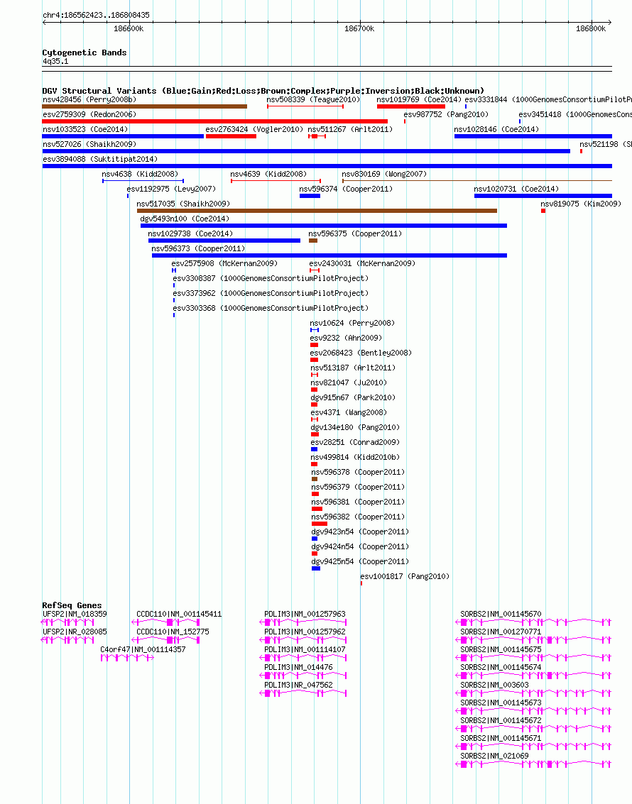 | Variant Type | CNV gain | Copy Number | | Allele State | | Allele Origin | | Probe Count | | Validation Flag | | Merged Status | M | Merged Variants | | Supporting Variants | essv25789628 | Samples | | Known Genes | C4orf47, CCDC110, PDLIM3, SORBS2, UFSP2 | Method | SNP array | Analysis | | Platform | Illumina HumanHap 610 | Comments | | Reference | Suktitipat_et_al_2014 | Pubmed ID | 25118596 | Accession Number(s) | esv3894088