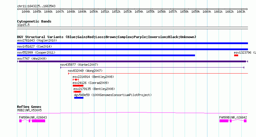 Variant DetailsVariant: esv7747 | Internal ID | 9951586 | | Landmark | | | Location Information | | | Cytoband | 11p15.5 | | Allele length | | Assembly | Allele length | | hg38 | 20319 | | hg19 | 20319 | | hg18 | 20319 |