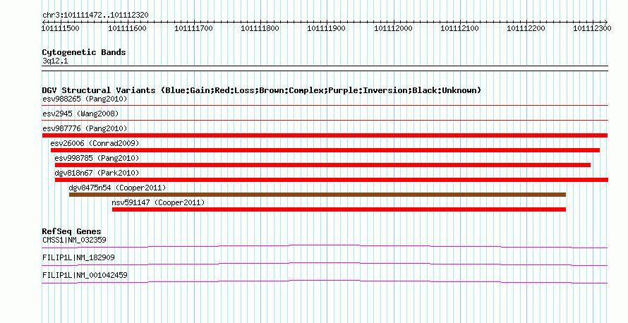 | | Variant Type | CNV deletion | | Copy Number | | | Allele State | | | Allele Origin | | | Probe Count | | | Validation Flag | | | Merged Status | M | | Merged Variants | | | Supporting Variants | essv3574963 | | Samples | HuRef | | Known Genes | CMSS1, FILIP1L, MIR548G | | Method | Sequencing | | Analysis | | | Platform | Sanger Sequencing | | Comments | | | Reference | Pang_et_al_2010 | | Pubmed ID | 20482838 | | Accession Number(s) | esv987776