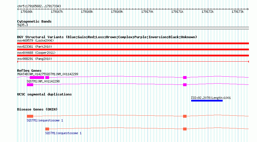 Variant DetailsVariant: esv988291| Internal ID | 6724265 | | Landmark | | | Location Information | | | Cytoband | 5q35.3 | | Allele length | | Assembly | Allele length | | hg38 | 7662 | | hg19 | 7662 | | hg18 | 7662 |
