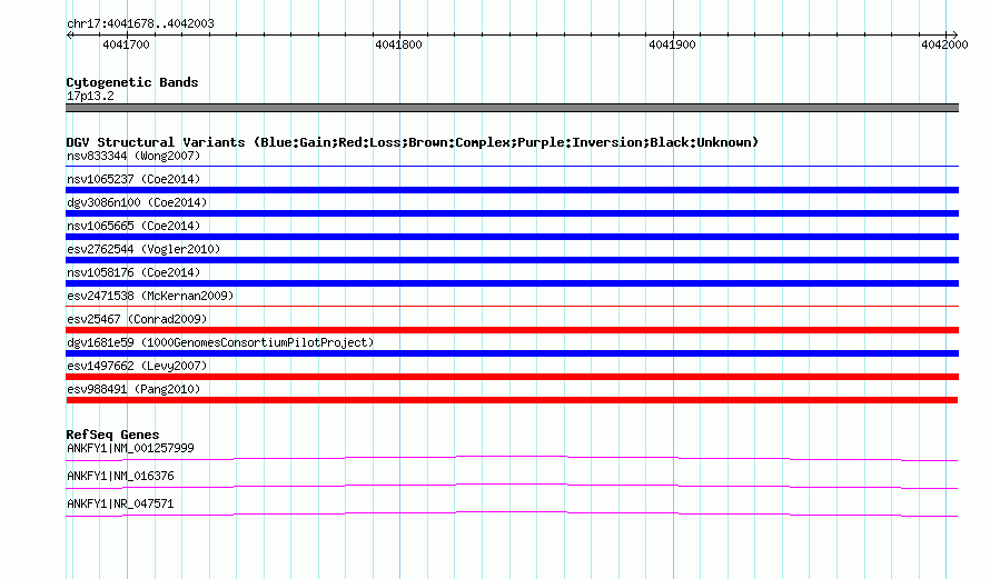 Variant DetailsVariant: esv988491| Internal ID | 7060438 | | Landmark | | | Location Information | | | Cytoband | 17p13.2 | | Allele length | | Assembly | Allele length | | hg38 | 326 | | hg19 | 326 | | hg18 | 326 |