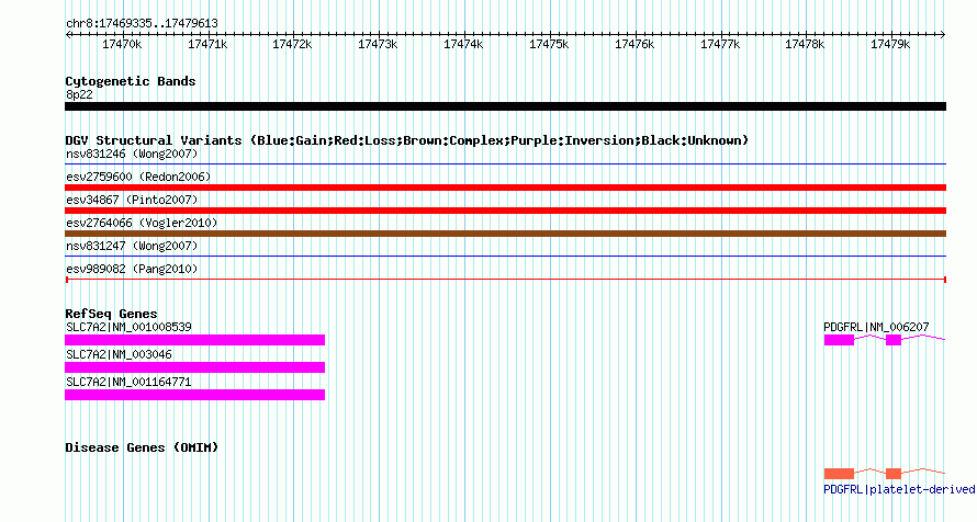 | | Variant Type | CNV deletion | | Copy Number | | | Allele State | | | Allele Origin | | | Probe Count | | | Validation Flag | | | Merged Status | M | | Merged Variants | | | Supporting Variants | essv3564967 | | Samples | HuRef | | Known Genes | PDGFRL, SLC7A2 | | Method | Sequencing | | Analysis | | | Platform | Sanger Sequencing | | Comments | | | Reference | Pang_et_al_2010 | | Pubmed ID | 20482838 | | Accession Number(s) | esv989082