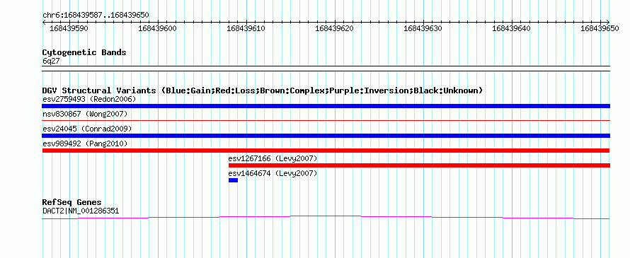 | | Variant Type | CNV deletion | | Copy Number | | | Allele State | | | Allele Origin | | | Probe Count | | | Validation Flag | | | Merged Status | M | | Merged Variants | | | Supporting Variants | essv3581438 | | Samples | HuRef | | Known Genes | DACT2 | | Method | Sequencing | | Analysis | | | Platform | Sanger Sequencing | | Comments | | | Reference | Pang_et_al_2010 | | Pubmed ID | 20482838 | | Accession Number(s) | esv989492