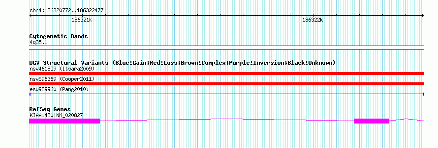 | Variant Type | CNV insertion | Copy Number | | Allele State | | Allele Origin | | Probe Count | | Validation Flag | | Merged Status | M | Merged Variants | | Supporting Variants | essv3563578 | Samples | HuRef | Known Genes | KIAA1430 | Method | Sequencing | Analysis | | Platform | Sanger Sequencing | Comments | | Reference | Pang_et_al_2010 | Pubmed ID | 20482838 | Accession Number(s) | esv989960