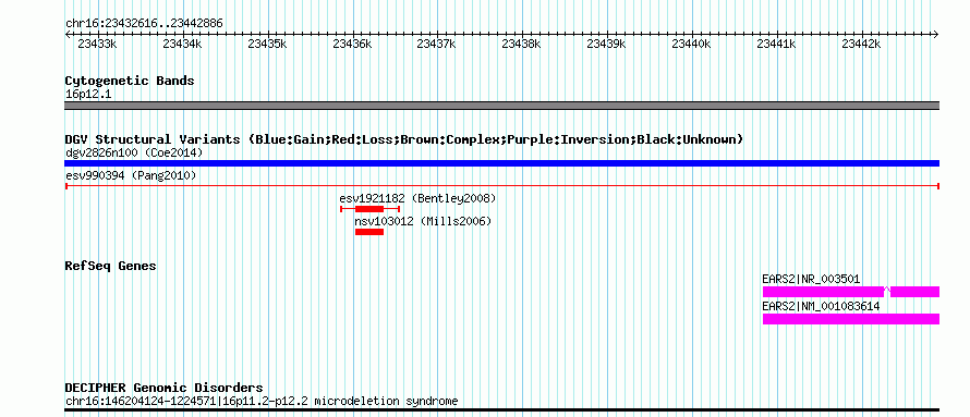 Variant DetailsVariant: esv990394| Internal ID | 7061520 | | Landmark | | | Location Information | | | Cytoband | 16p12.1 | | Allele length | | Assembly | Allele length | | hg38 | 10271 | | hg19 | 10271 | | hg18 | 10271 |
