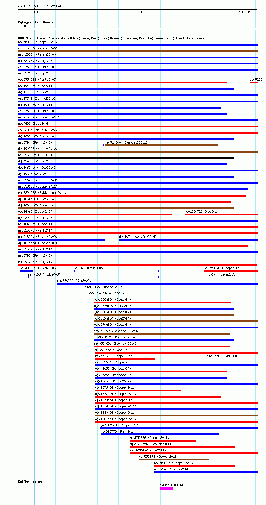 Variant DetailsVariant: esv992072| Internal ID | 7077746 | | Landmark | | | Location Information | | | Cytoband | 11p15.1 | | Allele length | | Assembly | Allele length | | hg38 | 22740 | | hg19 | 22740 | | hg18 | 22740 |