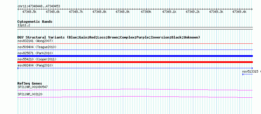 | | Variant Type | CNV insertion | | Copy Number | | | Allele State | | | Allele Origin | | | Probe Count | | | Validation Flag | | | Merged Status | M | | Merged Variants | | | Supporting Variants | essv3564807 | | Samples | HuRef | | Known Genes | SPI1 | | Method | Sequencing | | Analysis | | | Platform | Sanger Sequencing | | Comments | | | Reference | Pang_et_al_2010 | | Pubmed ID | 20482838 | | Accession Number(s) | esv992404
