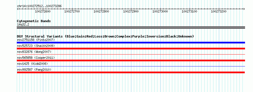 Variant DetailsVariant: esv992587| Internal ID | 7078148 | | Landmark | | | Location Information | | | Cytoband | 14q32.2 | | Allele length | | Assembly | Allele length | | hg38 | 775 | | hg19 | 775 | | hg18 | 775 |