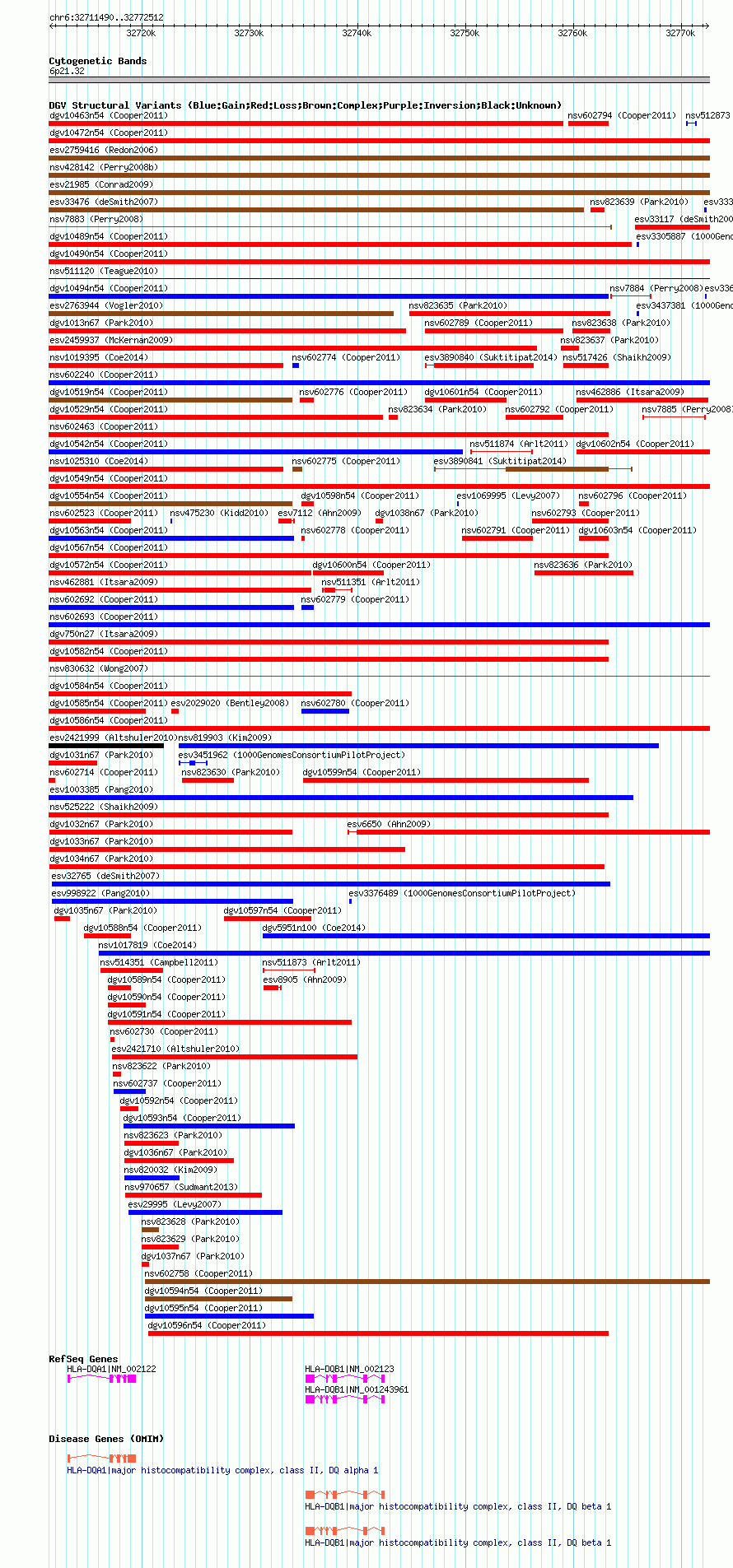 | Variant DetailsVariant: esv9939| Internal ID | 11047378 |  | Landmark |  |  | Location Information |  |  | Cytoband | 6p21.32 |  | Allele length | | Assembly | Allele length |  | hg38 | 61023 |  | hg19 | 61023 |  | hg18 | 61023 |