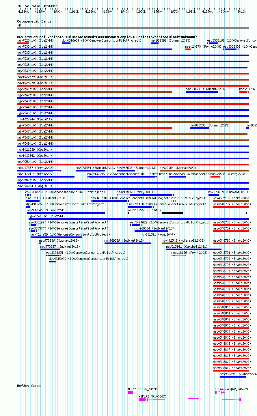 Variant DetailsVariant: esv994034| Internal ID | 7062829 | | Landmark | | | Location Information | | | Cytoband | 9p12 | | Allele length | | Assembly | Allele length | | hg38 | 138146 | | hg19 | 138146 | | hg18 | 138146 |