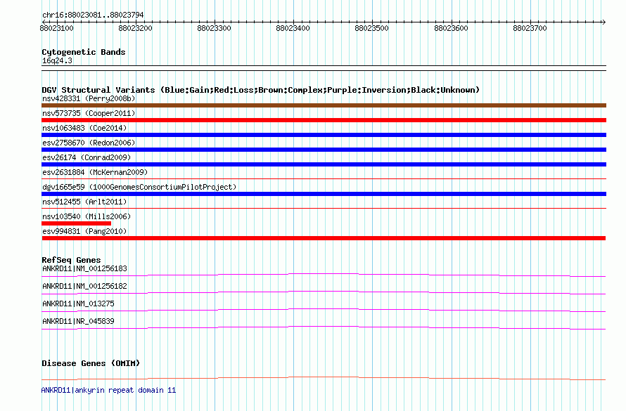 Variant DetailsVariant: esv994831| Internal ID | 7079366 | | Landmark | | | Location Information | | | Cytoband | 16q24.3 | | Allele length | | Assembly | Allele length | | hg38 | 714 | | hg19 | 714 | | hg18 | 714 |