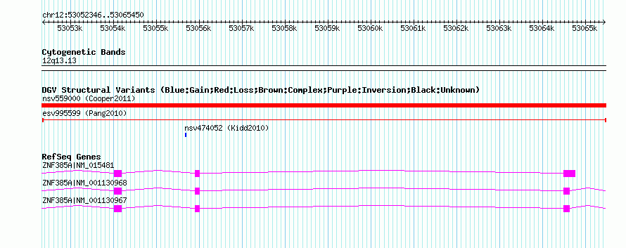 Variant DetailsVariant: esv995599| Internal ID | 7080022 | | Landmark | | | Location Information | | | Cytoband | 12q13.13 | | Allele length | | Assembly | Allele length | | hg38 | 13105 | | hg19 | 13105 | | hg18 | 13105 |