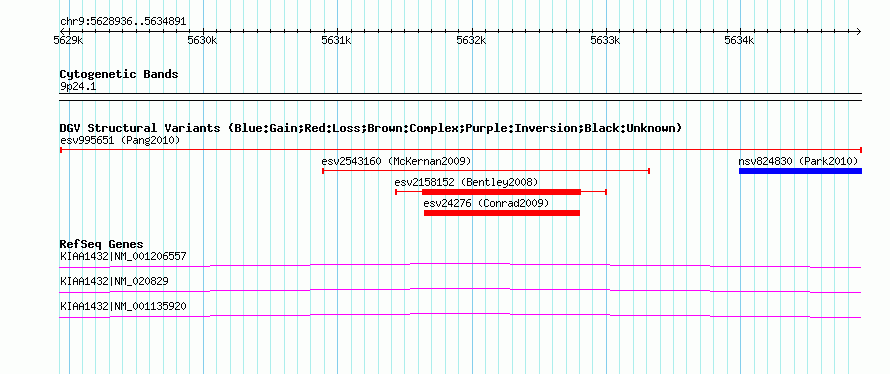 Variant DetailsVariant: esv995651| Internal ID | 7063277 | | Landmark | | | Location Information | | | Cytoband | 9p24.1 | | Allele length | | Assembly | Allele length | | hg38 | 5956 | | hg19 | 5956 | | hg18 | 5956 |