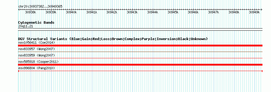 Variant DetailsVariant: esv996804| Internal ID | 7080774 | | Landmark | | | Location Information | | | Cytoband | 20q11.21 | | Allele length | | Assembly | Allele length | | hg38 | 11984 | | hg19 | 11984 | | hg18 | 11984 |