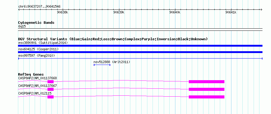 Variant DetailsVariant: esv997597| Internal ID | 7063936 | | Landmark | | | Location Information | | | Cytoband | 6q15 | | Allele length | | Assembly | Allele length | | hg38 | 3073 | | hg19 | 3073 | | hg18 | 3073 |