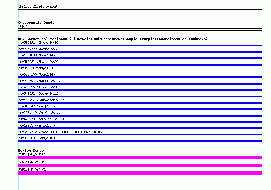 Variant DetailsVariant: esv998388| Internal ID | 7081791 | | Landmark | | | Location Information | | | Cytoband | 10p15.1 | | Allele length | | Assembly | Allele length | | hg38 | 65 | | hg19 | 65 | | hg18 | 65 |