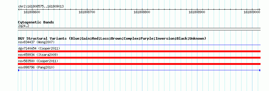Variant DetailsVariant: esv998796| Internal ID | 7064549 | | Landmark | | | Location Information | | | Cytoband | 2q24.2 | | Allele length | | Assembly | Allele length | | hg38 | 7597 | | hg19 | 7597 | | hg18 | 7597 |