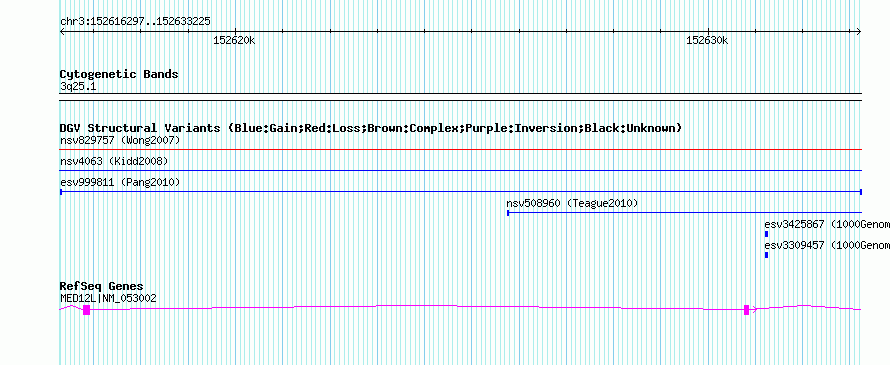 Variant DetailsVariant: esv999811| Internal ID | 7082419 | | Landmark | | | Location Information | | | Cytoband | 3q25.1 | | Allele length | | Assembly | Allele length | | hg38 | 10589 | | hg19 | 10589 | | hg18 | 10589 |