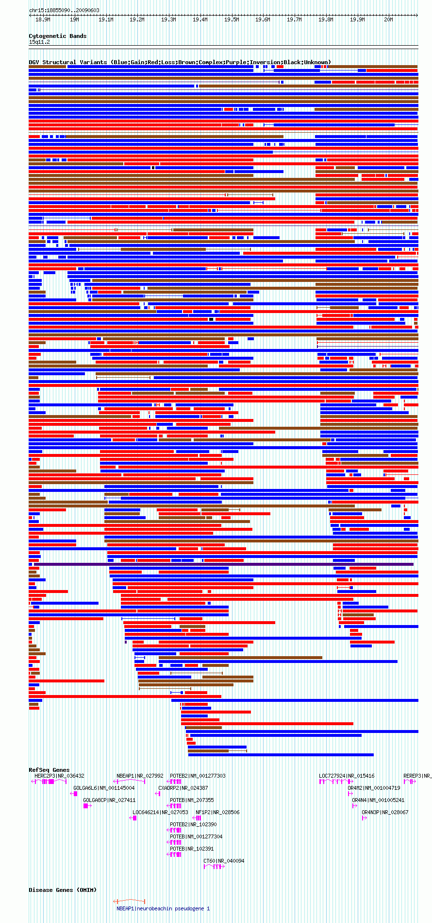 Variant DetailsVariant: nssv10040| Internal ID | 15542757 | | Landmark | | | Location Information | | | Cytoband | 15q11.1 | | Allele length | | Assembly | Allele length | | hg38 | 1911466 | | hg19 | 1994164 | | hg18 | 1235514 | | hg17 | 1235514 |