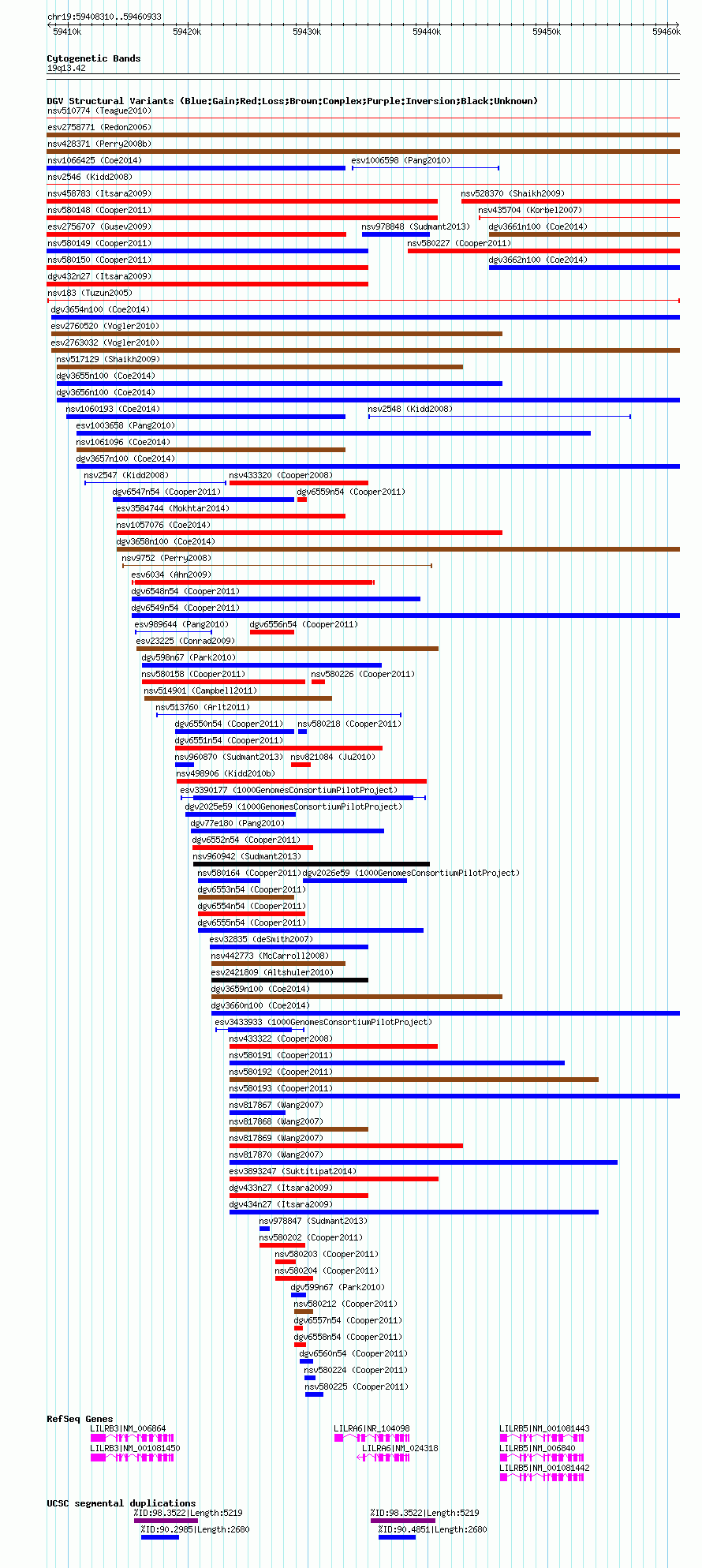 Variant DetailsVariant: nssv11003| Internal ID | 15192905 | | Landmark | | | Location Information | | | Cytoband | 19q13.42 | | Allele length | | Assembly | Allele length | | hg38 | 52639 | | hg19 | 52624 | | hg18 | 52624 | | hg17 | 52624 |