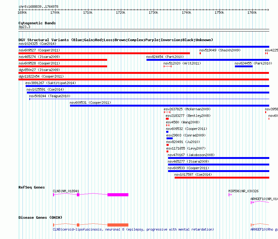 Variant DetailsVariant: nssv1155947| Internal ID | 15855763 | | Landmark | | | Location Information | | | Cytoband | 8p23.3 | | Allele length | | Assembly | Allele length | | hg38 | 76140 | | hg19 | 76140 | | hg18 | 76140 |