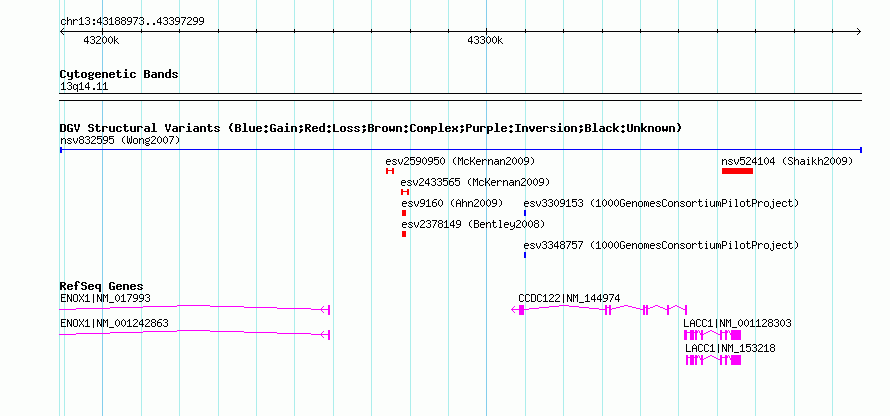 Variant DetailsVariant: nssv1450216 | Internal ID | 16100820 | | Landmark | | | Location Information | | | Cytoband | 13q14.11 | | Allele length | | Assembly | Allele length | | hg38 | 208327 | | hg19 | 208327 | | hg18 | 208327 | | hg17 | 208327 |