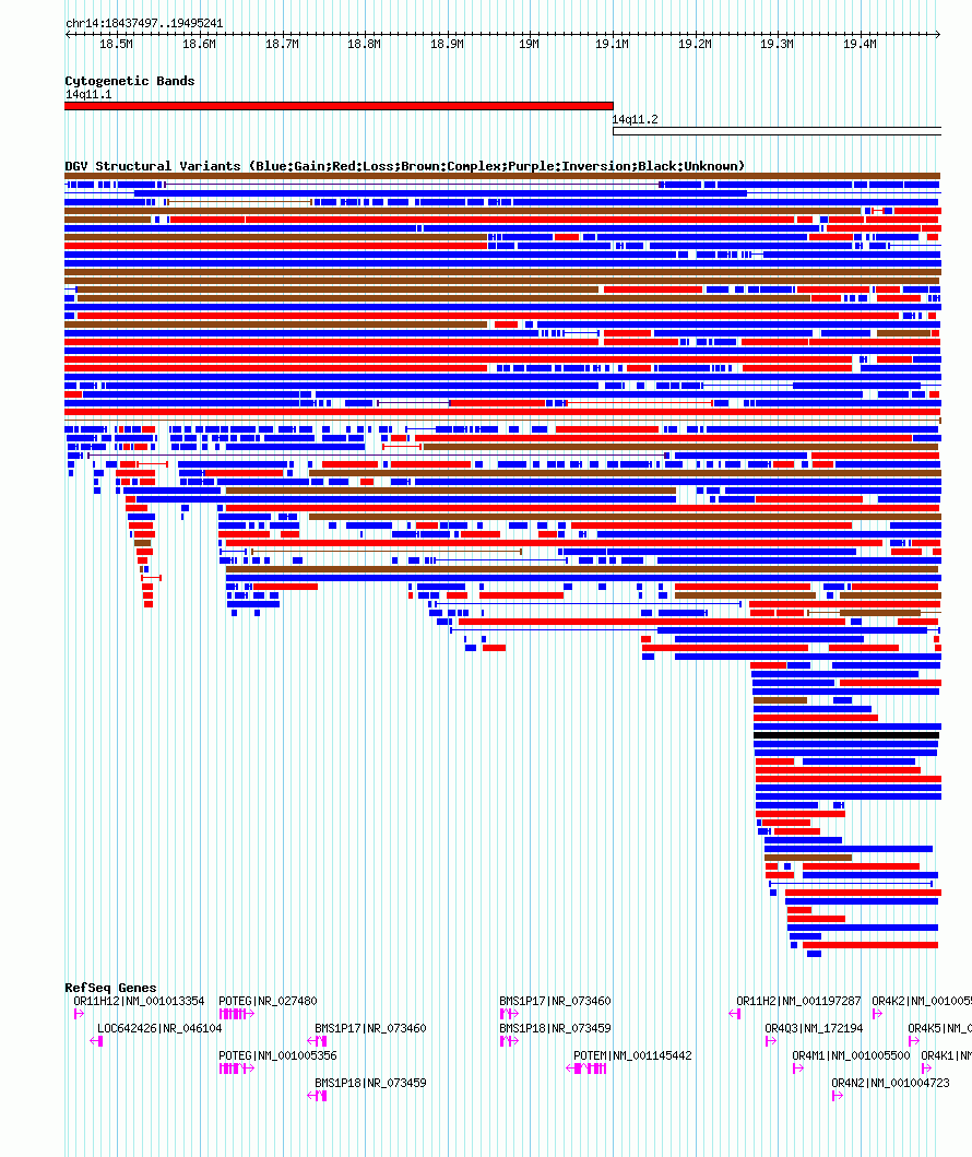 Variant DetailsVariant: nssv19385| Internal ID | 15828894 | | Landmark | | | Location Information | | | Cytoband | 14q11.1 | | Allele length | | Assembly | Allele length | | hg38 | 1366223 | | hg19 | 1057905 | | hg18 | 1057745 | | hg17 | 1057745 |