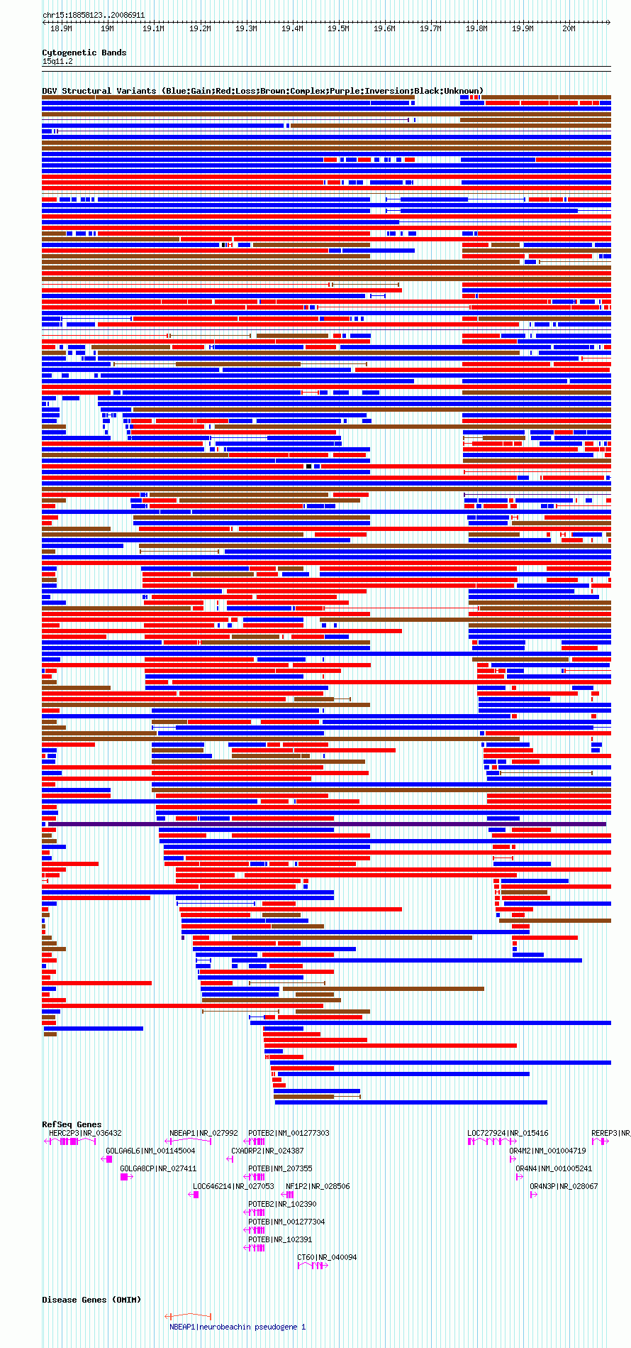 Variant DetailsVariant: nssv2097| Internal ID | 15541380 | | Landmark | | | Location Information | | | Cytoband | 15q11.1 | | Allele length | | Assembly | Allele length | | hg38 | 1904741 | | hg19 | 1987439 | | hg18 | 1228789 | | hg17 | 1228789 |