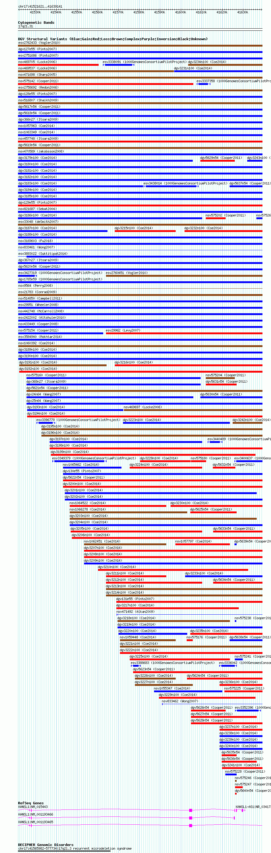 Variant DetailsVariant: nssv3546355| Internal ID | 18844636 | | Landmark | | | Location Information | | | Cytoband | 17q21.31 | | Allele length | | Assembly | Allele length | | hg38 | 117562 | | hg19 | 117562 | | hg18 | 117521 |