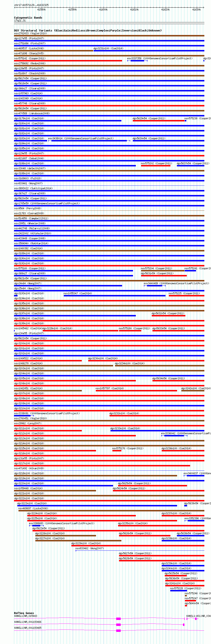 Variant DetailsVariant: nssv3556628| Internal ID | 18854909 | | Landmark | | | Location Information | | | Cytoband | 17q21.31 | | Allele length | | Assembly | Allele length | | hg38 | 61197 | | hg19 | 61197 | | hg18 | 61197 |