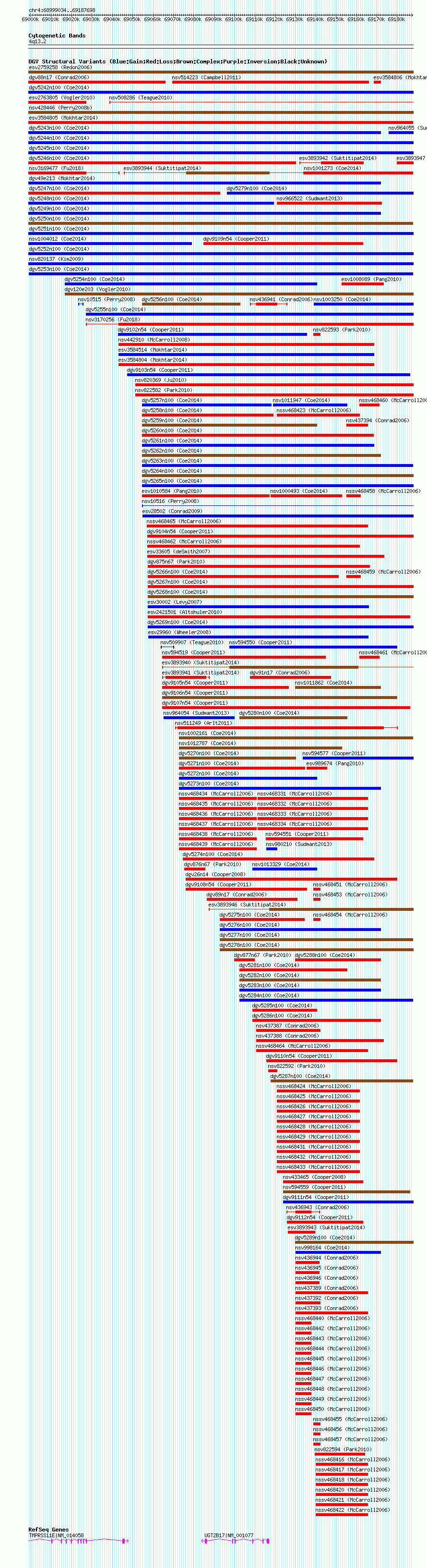 | | Variant Type | CNV gain | | Copy Number | | | Allele State | | | Allele Origin | | | Probe Count | | | Validation Flag | | | Merged Status | S | | Merged Variants | nsv998130 | | Supporting Variants | | | Samples | | | Known Genes | TMPRSS11E, UGT2B17 | | Method | SNP array | | Analysis | Affymetrix SNP array copy number analysis | | Platform | Affymetrix SNP Array 6.0 | | Comments | | | Reference | Coe_et_al_2014 | | Pubmed ID | 25217958 | | Accession Number(s) | nssv3627055