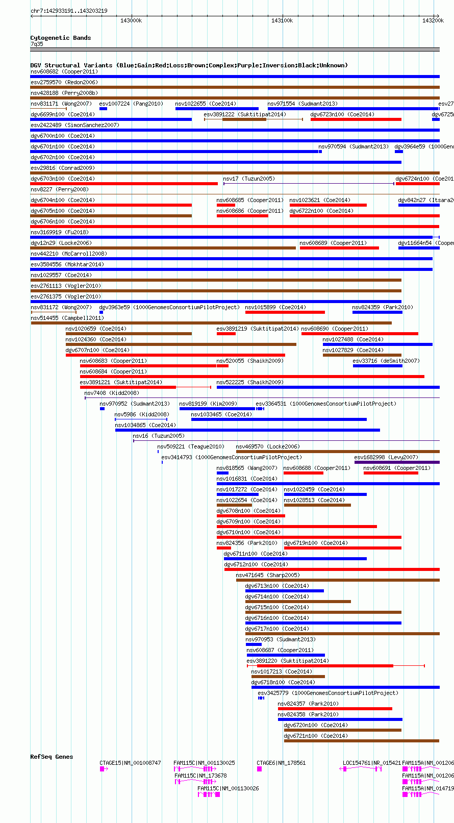 | | Variant Type | CNV gain | | Copy Number | | | Allele State | | | Allele Origin | | | Probe Count | | | Validation Flag | | | Merged Status | S | | Merged Variants | nsv1015674 | | Supporting Variants | | | Samples | | | Known Genes | CTAGE15, CTAGE6, FAM115A, FAM115C, LOC154761 | | Method | SNP array | | Analysis | Affymetrix SNP array copy number analysis | | Platform | Affymetrix SNP Array 6.0 | | Comments | | | Reference | Coe_et_al_2014 | | Pubmed ID | 25217958 | | Accession Number(s) | nssv3670307