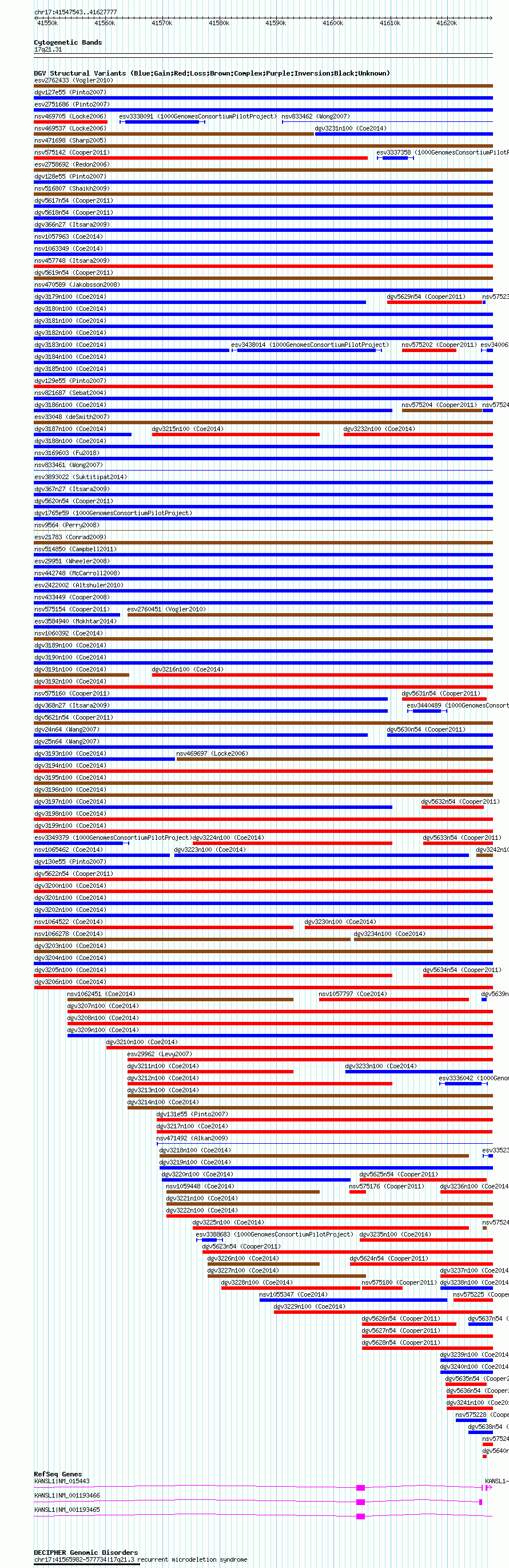 Variant DetailsVariant: nssv3720620| Internal ID | 19018901 | | Landmark | | | Location Information | | | Cytoband | 17q21.31 | | Allele length | | Assembly | Allele length | | hg38 | 80235 | | hg19 | 80235 | | hg18 | 80235 |