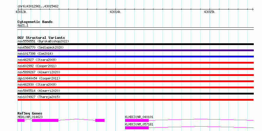 Variant DetailsVariant: nssv3763888| Internal ID | 19314989 | | Landmark | | | Location Information | | | Cytoband | 6p21.1 | | Allele length | | Assembly | Allele length | | hg38 | 2502 | | hg19 | 2502 |