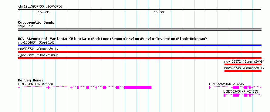 Variant DetailsVariant: nssv652245Internal ID | 15042211 | Landmark | | Location Information | | Cytoband | 19p13.12 | Allele length | Assembly | Allele length | hg38 | 20942 | hg19 | 20942 | hg18 | 20942 | hg17 | 20942 |
