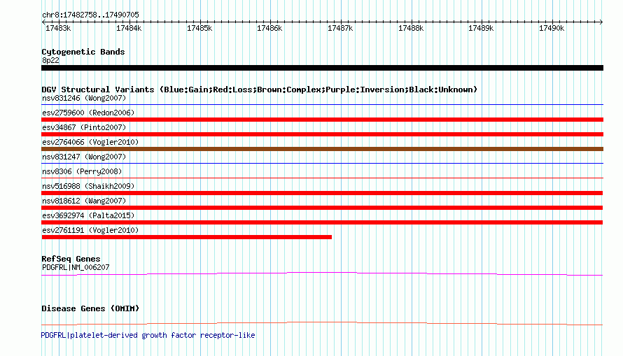 Variant DetailsVariant: nssv653558| Internal ID | 15390210 | | Landmark | | | Location Information | | | Cytoband | 8p22 | | Allele length | | Assembly | Allele length | | hg38 | 7955 | | hg19 | 7955 | | hg18 | 7948 | | hg17 | 7948 |